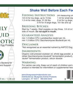 Guaranteed analysis: 1 billion CFU canine Lactobacillus reuteri per ml, 1 billion Saccharomyces boulardii per ml